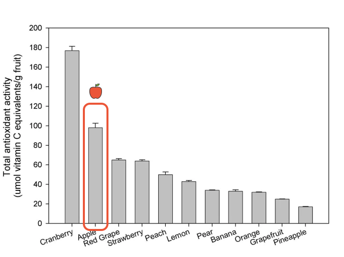有研究將蔓越莓、蘋(píng)果、葡萄、草莓、桃子、檸檬等幾種較常見(jiàn)的抗氧化水果進(jìn)行對(duì)比,發(fā)現(xiàn)蘋(píng)果的抗氧化能力確實(shí)非常強(qiáng)!