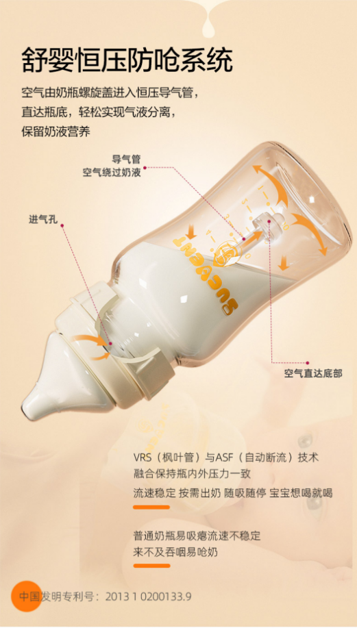 傳統(tǒng)奶瓶在沖奶后內(nèi)外壓力不均,導(dǎo)致奶液流速不穩(wěn)定,寶寶被動(dòng)嗆奶。而舒嬰防嗆奶瓶的智能恒壓防嗆系統(tǒng),通過內(nèi)置專利導(dǎo)管保持內(nèi)外氣壓一致,穩(wěn)定流速的同時(shí)實(shí)現(xiàn)氣液分離,顯著降低嗆奶與脹氣風(fēng)險(xiǎn),讓每一次喂養(yǎng)都更安全、更舒適。
