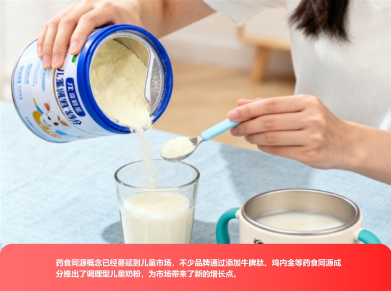 藥食同源概念已經蔓延到兒童市場,不少品牌通過添加牛脾肽、雞內金等藥食同源成分推出了調理型兒童奶粉,為市場帶來了新的增長點。