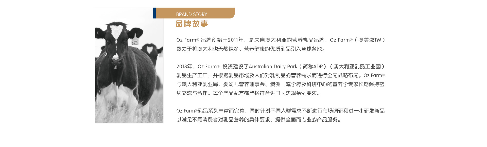 - 品牌特色:營養是產品質量中的重要組成部分,Oz Farm擁有專業的營養研究和產品研發隊伍,從具有40余年乳品經驗的老專家,到年輕的營養碩士,研發團隊深入研究各年齡體群體的營養需求,并開發定制有效配方,在配方研發中,都會驗證新的營養及原料,確認其能夠提供更好的營養,并且對人體健康有益,在全面認定營養的安全性后,就會開發新的配方給消費者更好的營養產品