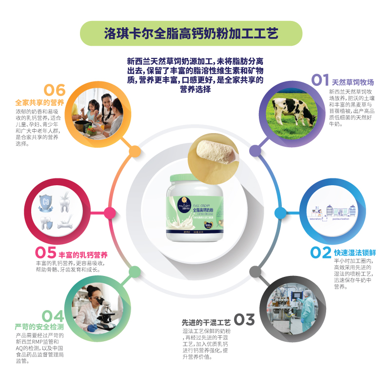 - 品牌特色:Rowi care洛琪卡爾全脂高鈣奶粉采用新西蘭天然草飼奶源,濃郁的奶香和易吸收的乳鈣營養,采用極簡的配方,95%新西蘭純草飼奶粉和5%乳鈣,鈣含量達到1000毫克每100克,比國標高鈣標準高出3倍多。適合兒童、孕 婦、青少年和廣大中 老年人群,是合家共享的蛋白質和鈣優質營養選擇。無激素、無蔗糖、無香精、無煉乳、無色素、無農殘、無化學添加劑,產品經過嚴苛 的新西蘭RMP監管和AQ的檢測,以及中國海關檢驗檢疫局、中國食品藥品監督管理局多重嚴格檢測和監管。品牌源自新西蘭毛利文化,專注新西蘭乳品,擁有完善的新西蘭奶源全鏈條供應鏈,全程可控,適合全家一起享用的營養全家桶。